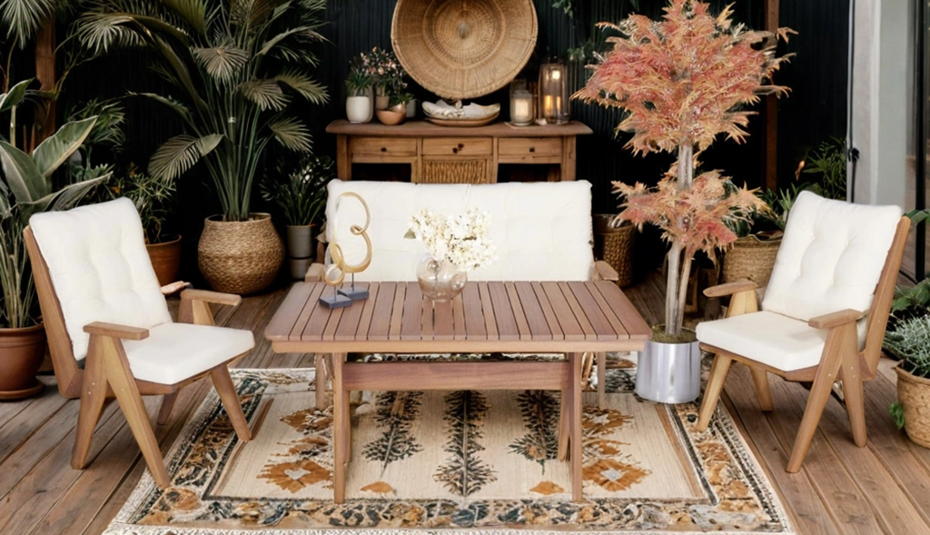 3.  Doğal İroko Ağacı: medium Oturma Grubu, dayanıklılığı ile bilinen iroko ağacından üretilmiştir. Doğal rengi ve dokusu ile doğayla iç içe, uzun ömürlü kullanım için tasarlanmıştır.